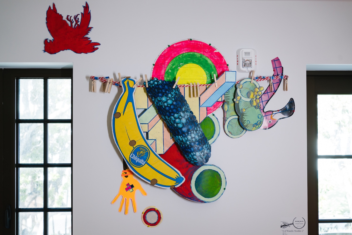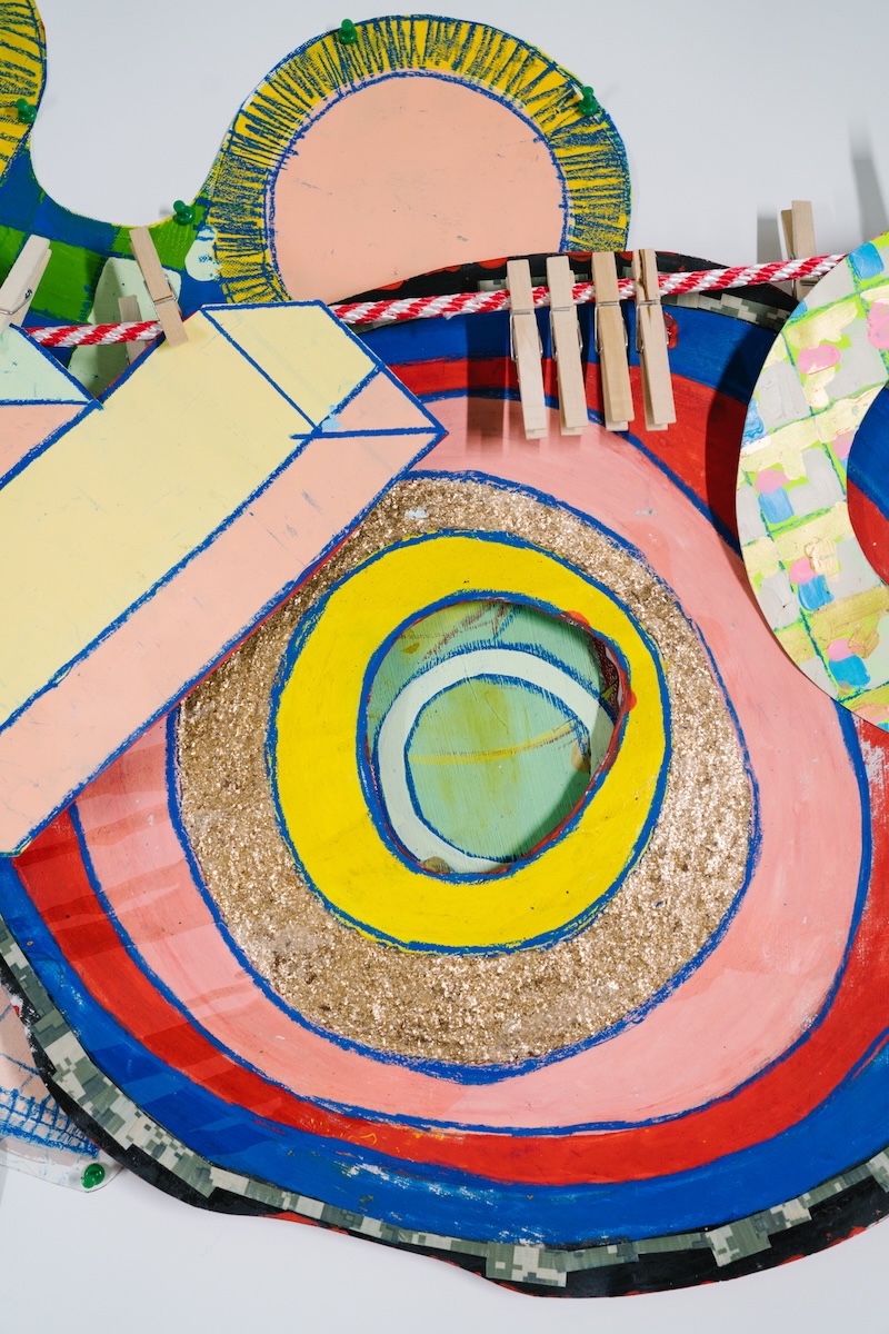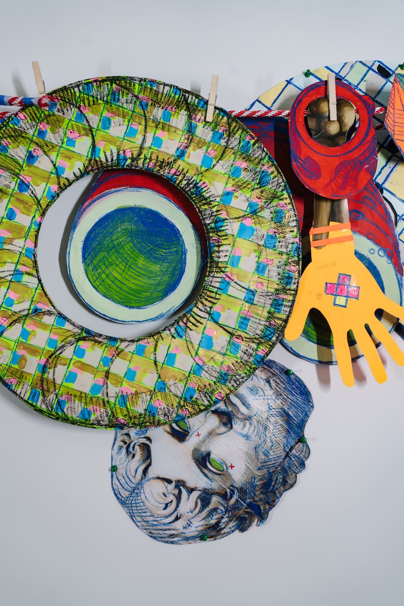 Both sides of each paper element are adorned with patterns and illustrations that reference a wide range of visual traditions, including classical art, occult symbology, and heraldic design. These dual-sided surfaces invite viewers to navigate the work physically and interpretively, uncovering new relationships between image and form.