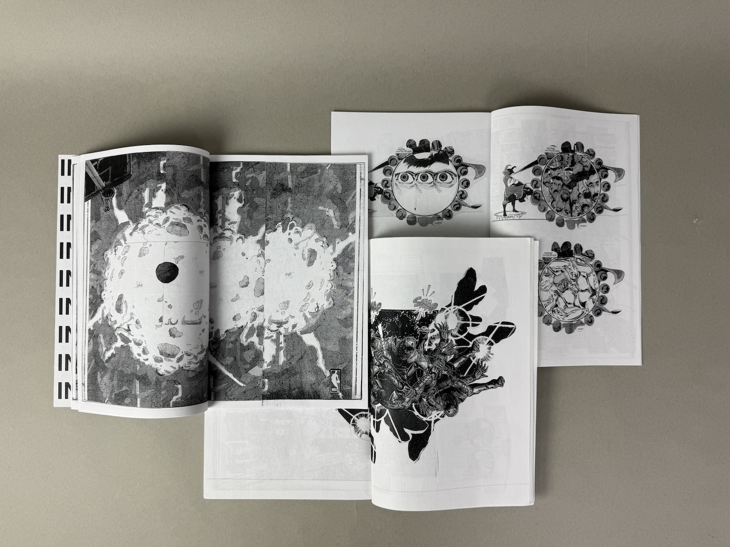 The Infinity Gauntlet: Amended Text is a meditation. Its content is derived from four Xerox copies of the first issue of the “Infinity Gauntlet” comic book. Copies were separated by page and collaged only with content from single 2 page spreads. This format offers a loose continuity that mimics the pace of the original publication and integrates the advertisements that interrupt the narrative. Each collage was put together with scissors, razor blades and scotch tape.