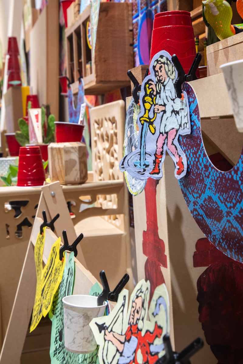 Living and Made is a 93-foot-long, public installation by artist Philip Lique that explores the intricate relationships between materials and the intentional and improvised act of “making” as it relates to the creative process. Referencing and re-contextualizing elements of retail window displays, theatrical scenery and backdrops, and traditional still-life arrangements, Lique’s work is an amalgamation of sculptures, wallpapers, paintings, ready-made sculptures, Walgreens products, and live cactus plants. The result is a grouping of visually-striking vignettes assembled from a combination of handmade, manufactured, and living contents.