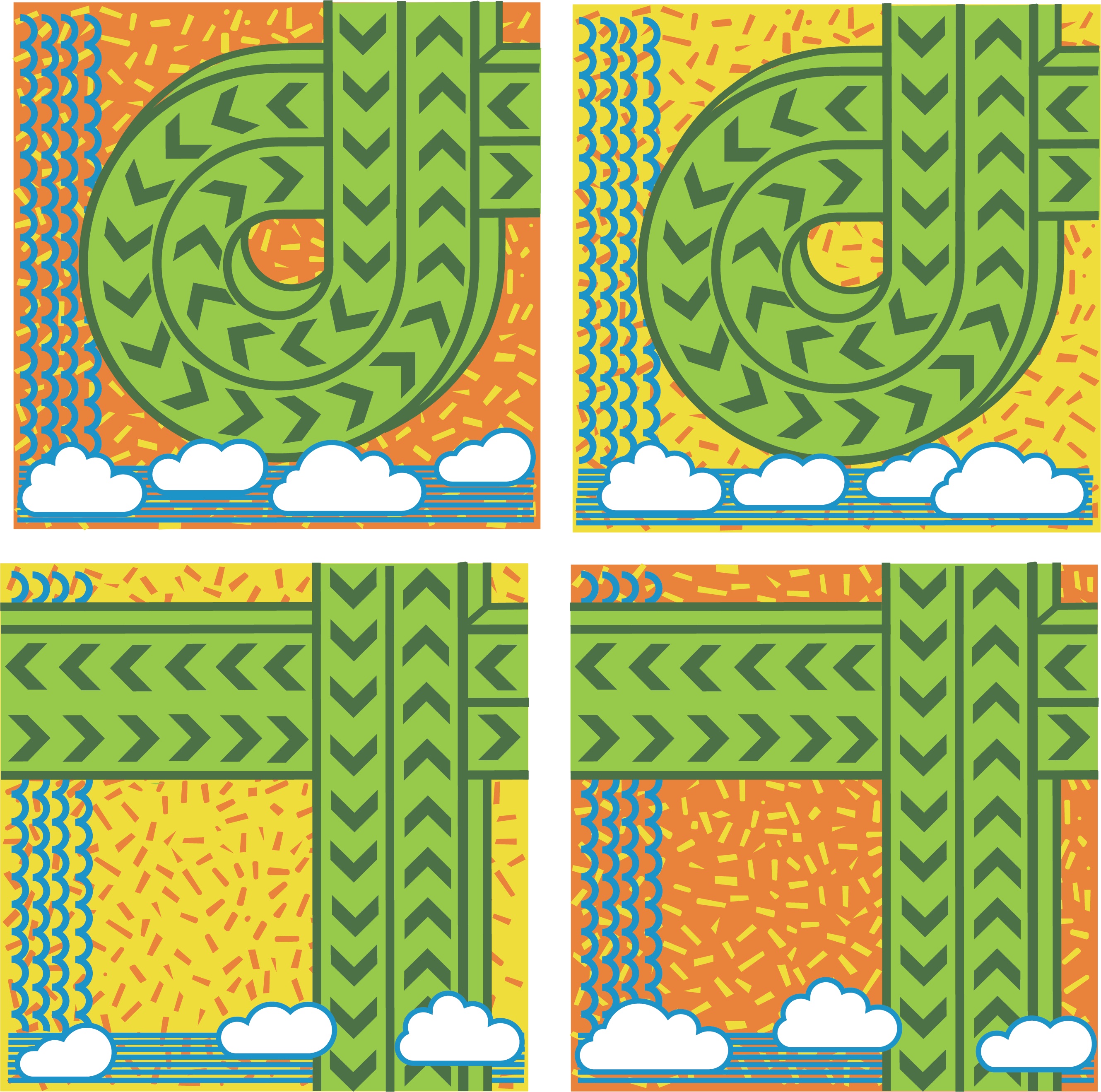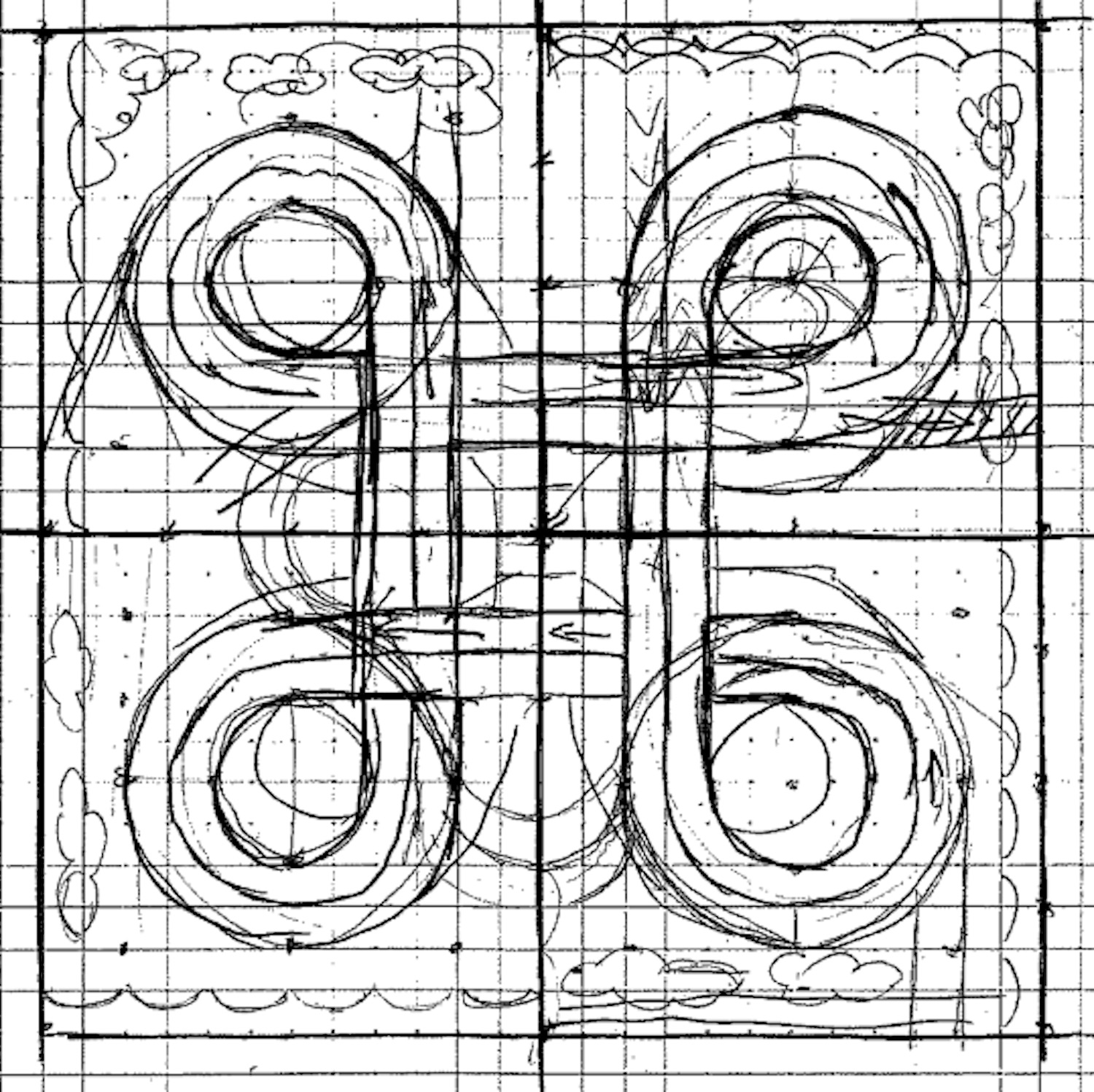 Each tile contains within it sky, water, terrazzo, and roadway (our collective modes of travel and connection, whether by foot, car, boat, or plane). When placed together in quadrants, the tiles align to form a larger composition: traffic loops set against an ocean horizon, where neighboring patterns meet at shared skies and waves.