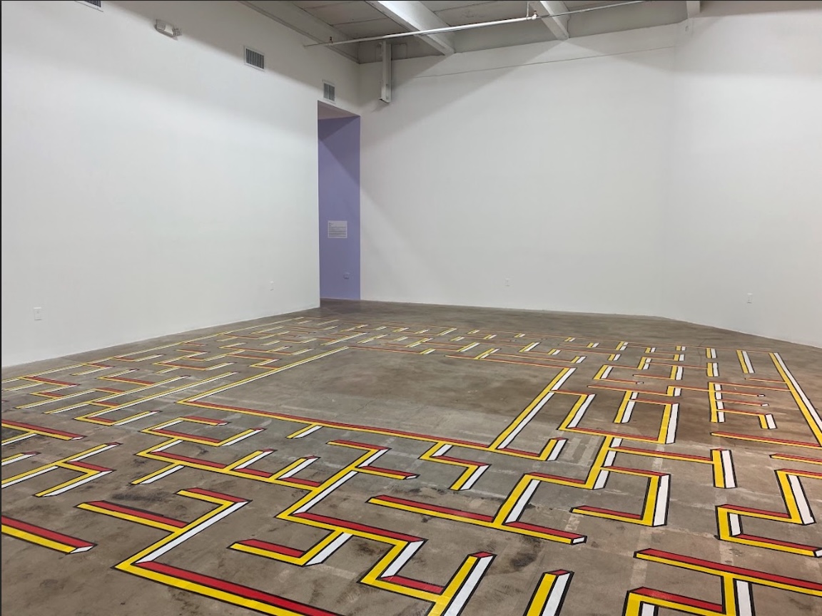 Planar Maze is a site-specific installation in Dot 51's main gallery space. Referencing the word "plane" and its definition as a flat surface, the artist adopts industrial tape as a medium to construct an isometric rendering of a 20" x 20" walkable maze on the gallery floor.